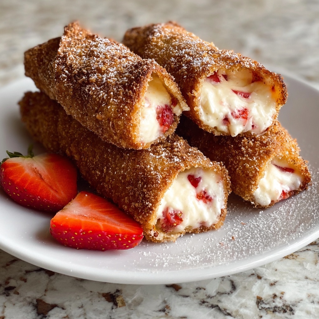 Your Strawberry Cheesecake Eggroll Bites Recipe is now ready to impress! Serve them warm for the best experience, with optional garnish like fresh strawberries or a dusting of powdered sugar.