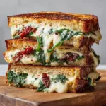 This Sun-Dried Tomato, Spinach, and Ricotta Grilled Cheese recipe offers a gourmet twist on the classic grilled cheese, combining creamy ricotta, mozzarella, and Parmesan cheeses with flavorful sun-dried tomatoes and fresh spinach. Perfectly toasted sourdough bread encases the savory filling, making it a satisfying vegetarian main course ideal for lunch or a light dinner.
