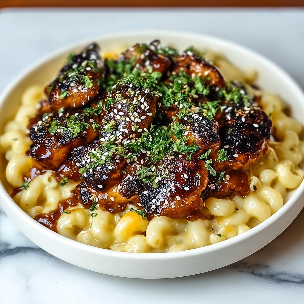 Serve this dish family-style on a large platter for a rustic, inviting feel that encourages sharing. Alternatively, plating the chicken and mac and cheese separately with a drizzle of extra sauce on top creates a restaurant-quality presentation. If you want to impress, top the mac and cheese with crispy breadcrumbs broiled until golden for added texture.
