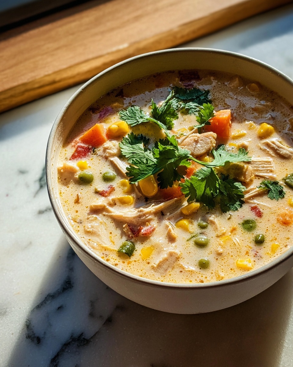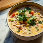 This creamy and flavorful White Chicken Chili combines tender shredded chicken, white beans, green chilies, and a blend of spices in a comforting, rich broth. Enhanced with Neufchâtel cheese for a velvety texture and topped with fresh cilantro, avocado, and crunchy tortilla chips, this chili is perfect for a cozy dinner that’s both satisfying and simple to prepare.