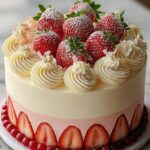 - Decorate and Serve: Garnish the cake with fresh whole and halved strawberries, sprinkle edible gold sprinkles on top, and lightly dust with powdered sugar. Slice, serve, and enjoy this stunning and delicious dessert!