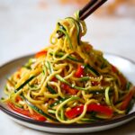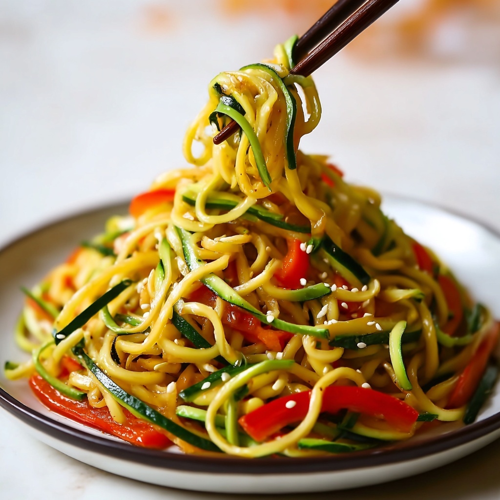 A quick and healthy zucchini noodle stir-fry, packed with colorful vegetables and flavored with garlic, ginger, and sesame oil. Perfect for a light, nutritious meal ready in just 25 minutes.
